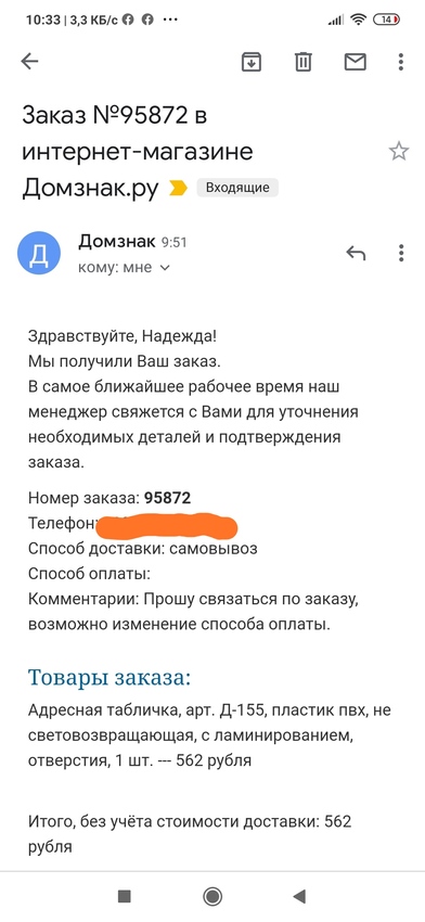 Для нас важно знать, что Вы остались довольны табличкой и сроками доставки.