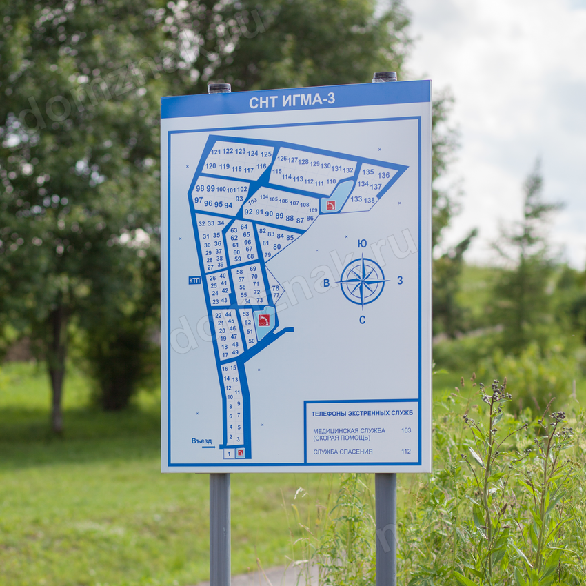Табличка из оцинковки поставляется в сборе со стойкой (опорой), изготовленной из окрашенной профильной трубы. Размер трубы – 25x25 или 30x30 мм. Стандартная высота стойки – 2,3 метра. По желанию заказчика мы изготавливаем стойки и таблички произвольного размера. При определении высоты стойки необходимо учитывать глубину погружения конструкции в землю (бетон).