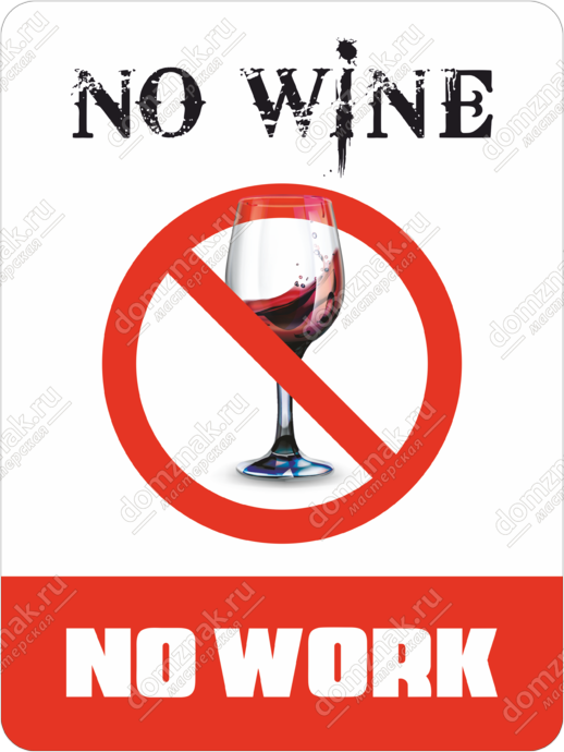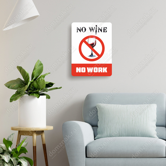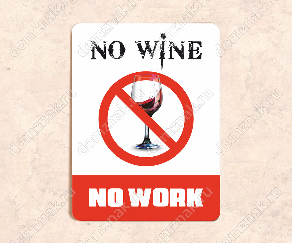 Табличка «No wine No work» изготовлена из пластика ПВХ, толщиной 4 мм. Изображение наносится по технологии УФ-печати. Табличка предназначена для использования как в помещении, так и на улице.