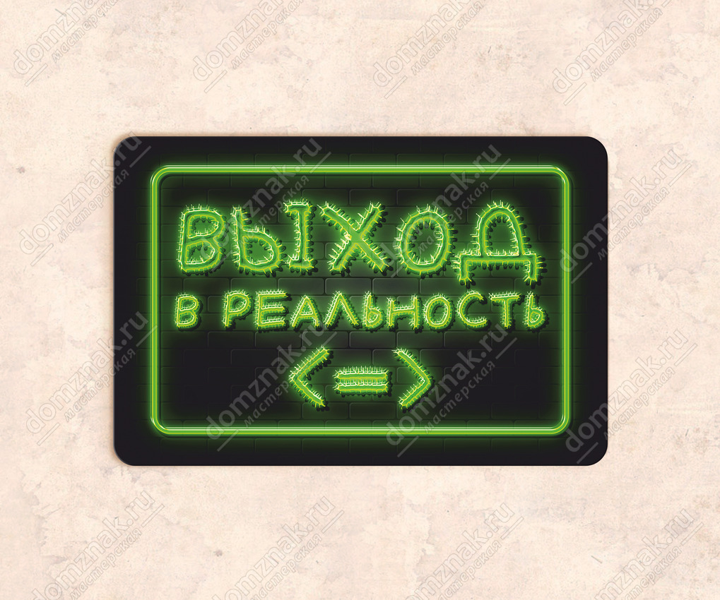 Табличку «Выход» можно обыграть по-разному. Для игровых клубов, центров квестов и приключений, кинотеатров и других общественных мест, где выбирают нестандартные решения в концепции и интерьере, мы разработали необычную табличку «Выход в реальность», которая покажет, где находится дверь в реальный мир. Черный фон, зеленые буквы, своеобразное оформление – декоративная табличка подчеркнет стиль заведения и его развлекательный статус.