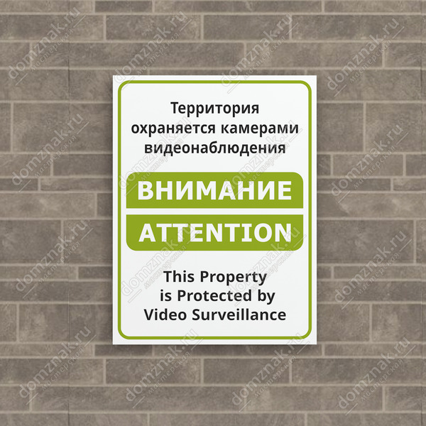 Предупреждающая табличка (знак) «Внимание Территория охраняется камерами видеонаблюдения / Attention This Property is Protected by Video Surveillance» выполнена в западной манере с английской вариацией надписи, где большинство информирующих и предупреждающих знаков выполняются на зеленом фоне. Такая табличка актуальна для отелей, туристических комплексов и развлекательных центров и терминалов аэропортов, где собирается большое количество иностранных представителей.
