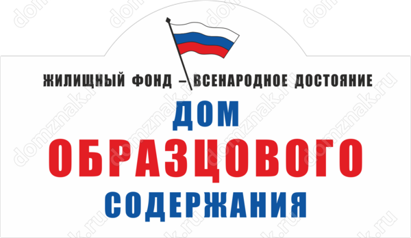 Оригинальная табличка «Дом образцового содержания» изготовлена в лучших традициях советского времени. Громкий лозунг, напоминающий «лесенку» Маяковского, российский флаг, яркая бело-сине-красная цветовая гамма – дом, украшенный такой табличкой, заметит каждый!